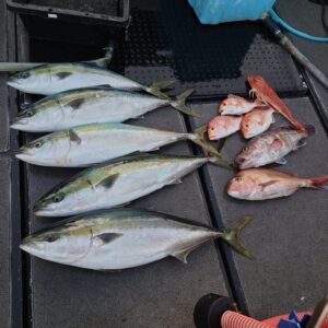 新着情報 3/15ジグ便 釣果情報 2026年04月27日(月曜日) 数は伸びませんでしたが9.6k頭でした🎵 なかなか厳しい戦いながらも 良型もまざり 嬉しいお土産の鯛も 拾い釣りしながら ナイスキャッチでした ブリ9.6k~5本、鯛、マハタ、レンコ3枚、ホウボウでした ご乗船ありがとうございました🎵 11日ジグ便 3/16ジグ/タイラバ便